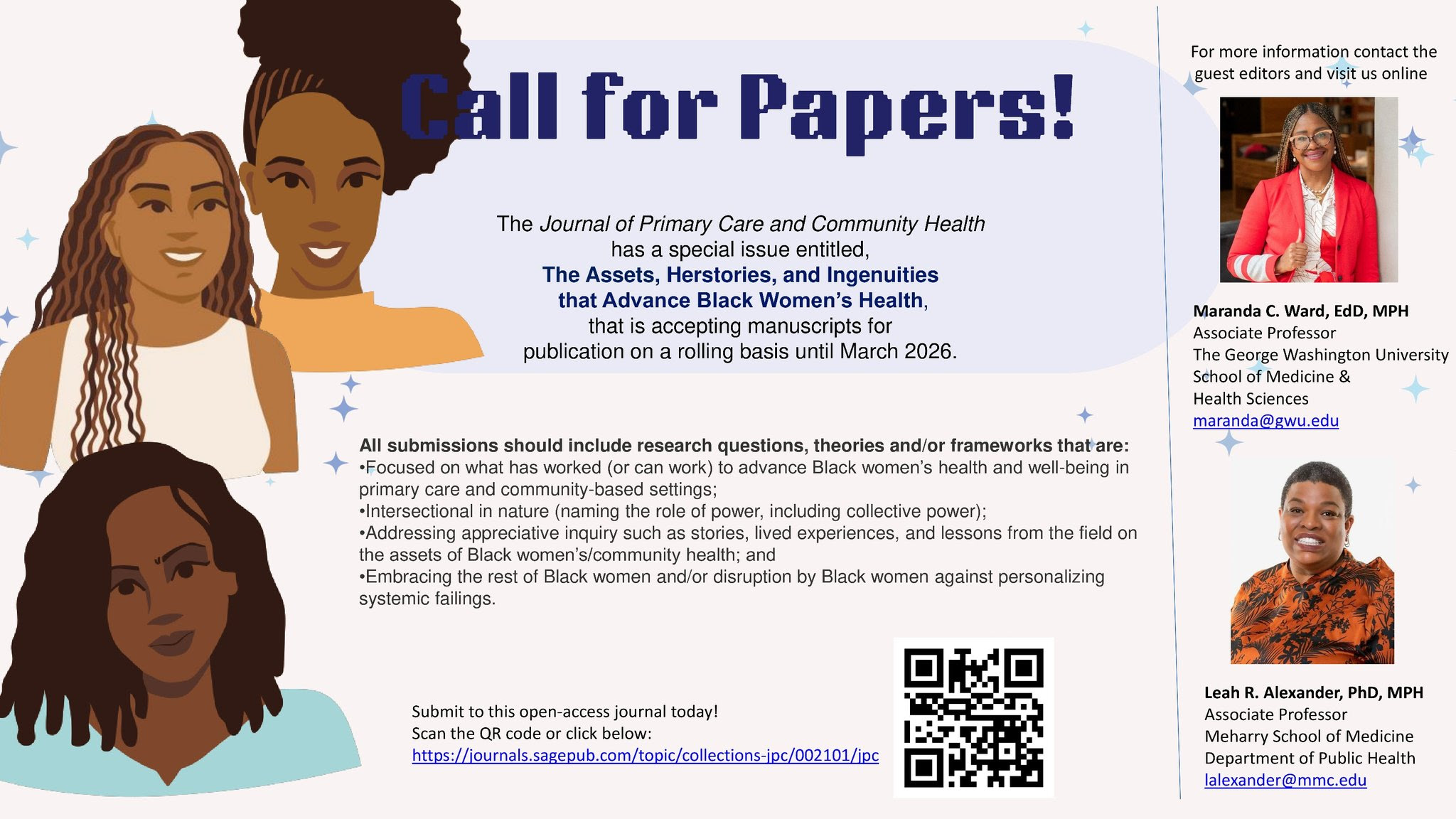 The Journal of Primary Care and Community Health has a special issue entitled, The Assets, Herstories, and Ingenuities that Advance Black Women’s Health, that is accepting manuscripts for publication on a rolling basis until March 2026.