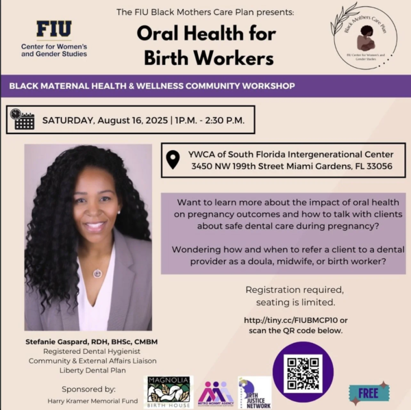 The FIU Black Mothers hosted a Maternal Health and Wellness Community Workshop on Saturday, August 16, 2025. This free workshop was designed for a wide range of community-based birth workers, especially early-career, practicing, and student midwives and doulas, who were interested in expanding their knowledge on oral health and its impact on pregnancy outcomes. Our guest speaker, Stafanie Gaspard, a registered dental hygienist, shared strategies to help birth workers integrate oral health support into the care they provide for families.