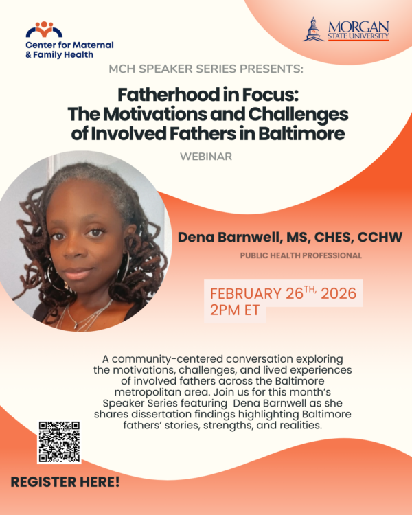 February 26 – February’s Speaker Series features Dena Barnwell, MS, CHES, CCHW sharing insights from her dissertation on Baltimore fathers. Join us for a live webinar exploring what motivates involved fatherhood, the challenges dads face, and how lived experience shapes family well-being. This session includes a facilitated conversation and open Q & A. The event is open to the community, and we invite caregivers, providers, and community members to join us for meaningful dialogue and shared learning.