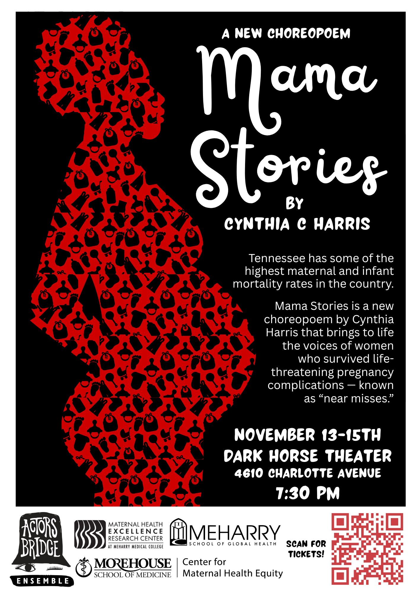 NASHVILLE, TN (October 15, 2025) – Actors Bridge Ensemble is proud to announce a new partnership with Meharry Medical College’s Maternal Health Excellence Research Center in the School of Global Health to present MAMA STORIES, the latest choreopoem by acclaimed Nashville artist Cynthia C. Harris.